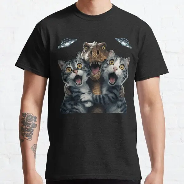 Футболка унисекс с коротким рукавом NWT, кошка, Селфи, динозавр и НФОС, Забавный мем, кошка и Ти-Рекс, мужские и женские футболки