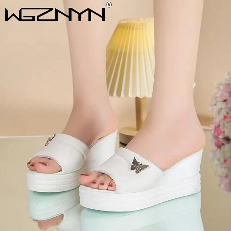 Женские шлепанцы на танкетке, мягкие кожаные сандалии на плоской подошве, с открытым носком, обувь на высоком каблуке, без застежки