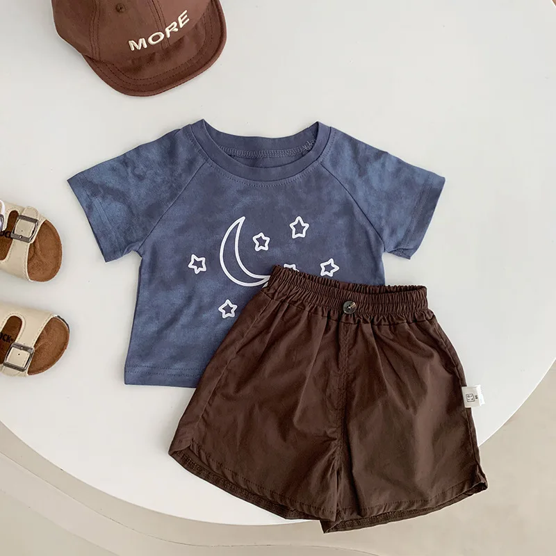 Футболка и шорты для мальчиков и девочек, повседневный комплект из 2 предметов, с принтом луны и звезд, однотонные хлопковые футболки в стиле ретро, лето