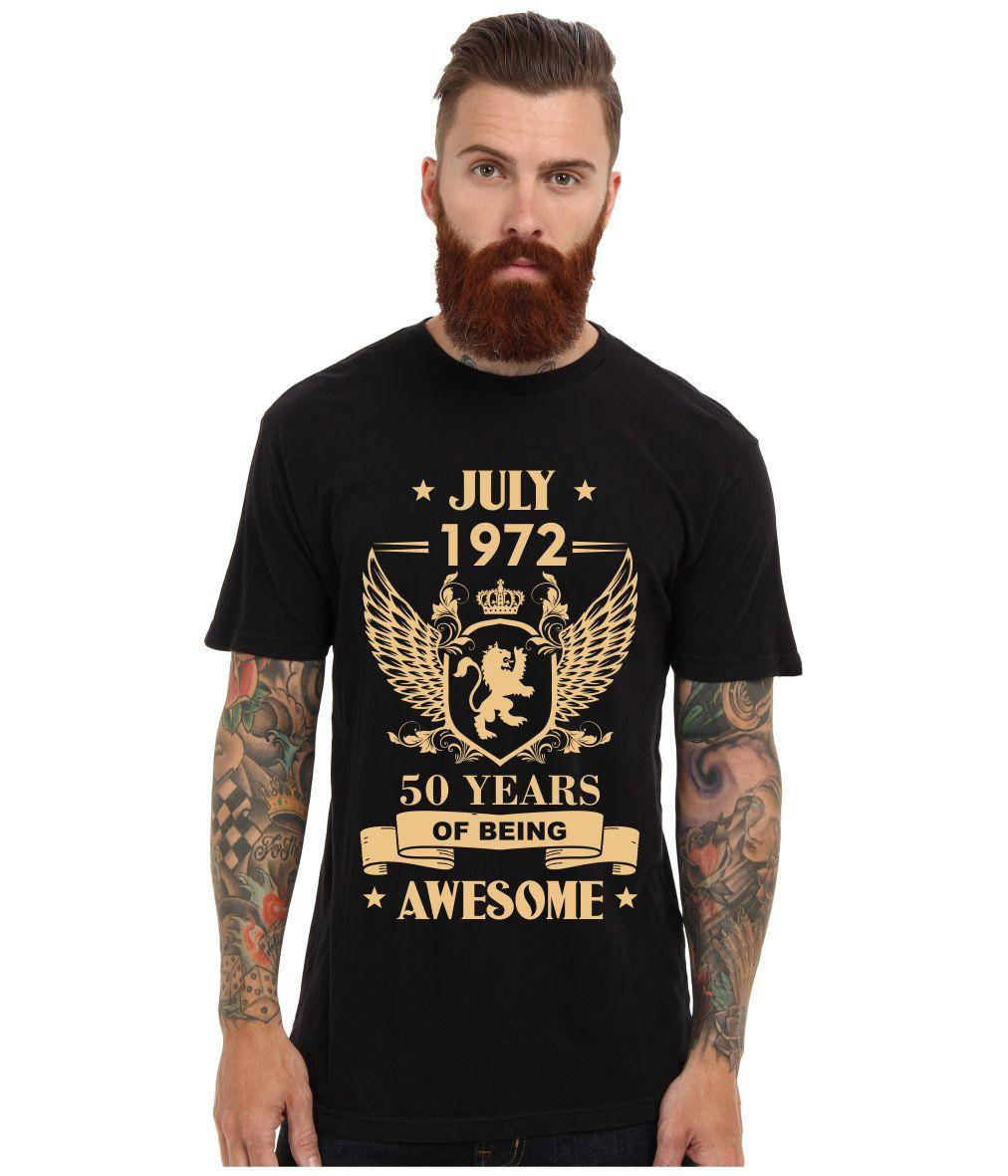 Футболка с надписью "July 1972. 50 years of being awesome" и дизайнерским оформлением. Прикольная футболка на подарок родному человеку или другу с оригинальным рисунком для июльского именинника. Имениннику такой подарок точно понравится. Крутой подарок на день рождение на 50 лет.