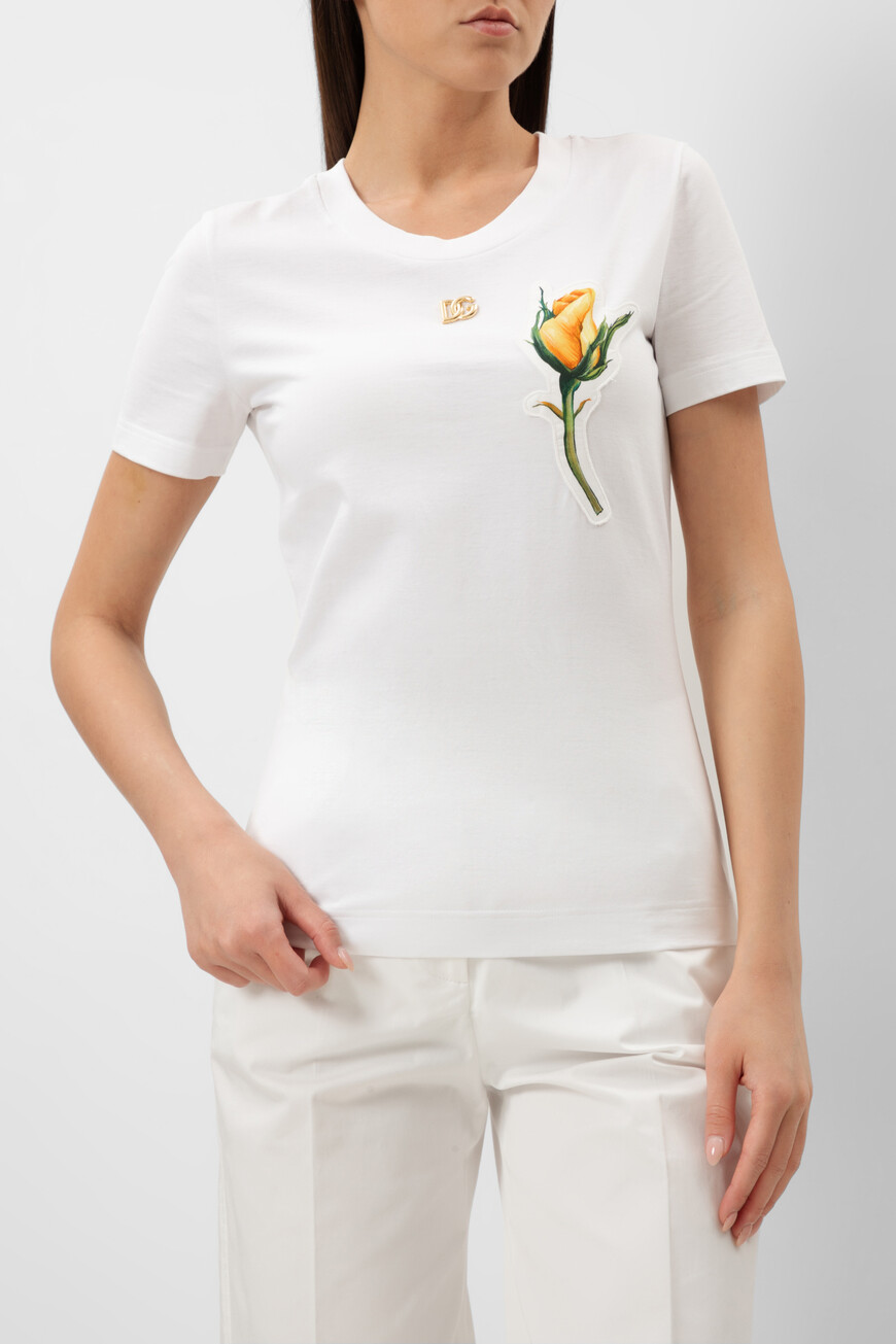 Приталенная футболка белого цвета от Dolce & Gabbana. Коллекция Flowering заставляет нас мечтать о далёких тёплых уголках этого мира, соединяя воедино белый, лимонно-жёлтый, различные оттенки зелёного и выверенный крой. Модель изготовлена из мягкого хлопкового джерси и украшена аппликацией с изображением розы.
