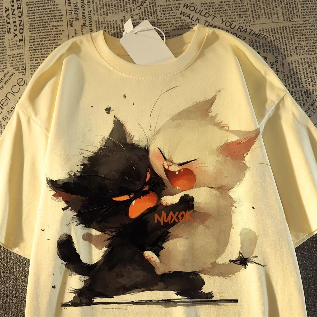 Футболка Harajuku Oversize, высокое качество, 200 г, 100% хлопок, футболка, летняя, 2025 г., забавная футболка с принтом мультяшного кота для женщин, одежда, топы Y2k, уличная одежда M бежевый