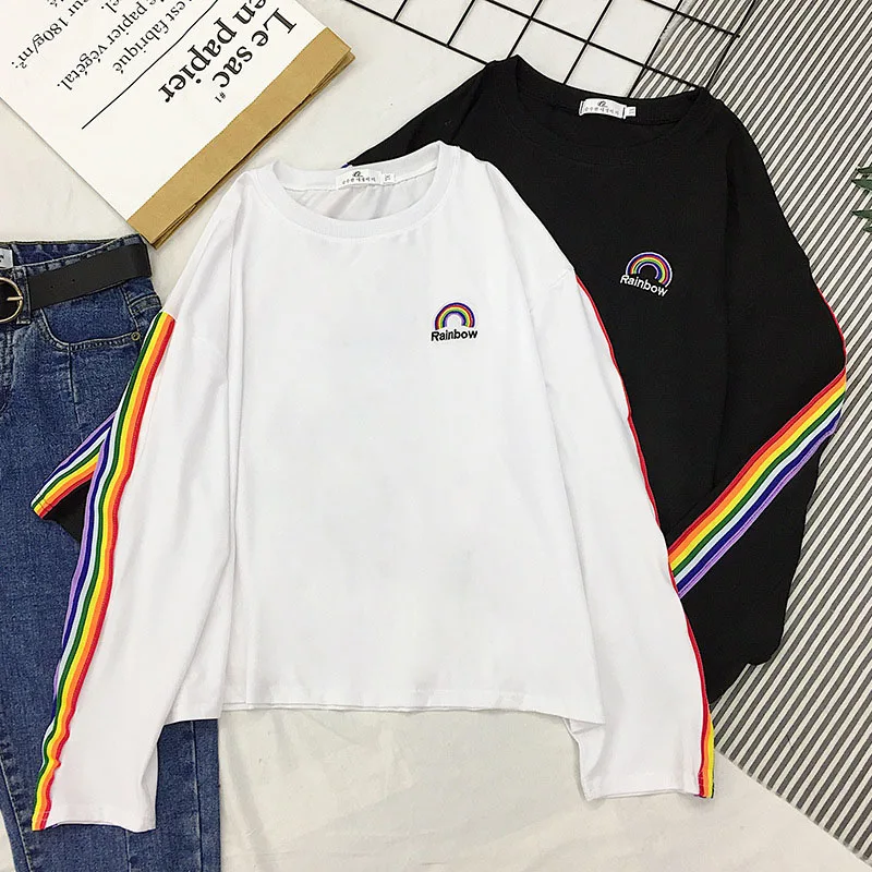 Футболки в радужную полоску Kawaii с длинным рукавом мягкая свободная вышивка в Корейском стиле женская футболка Милая модная женская футболк...