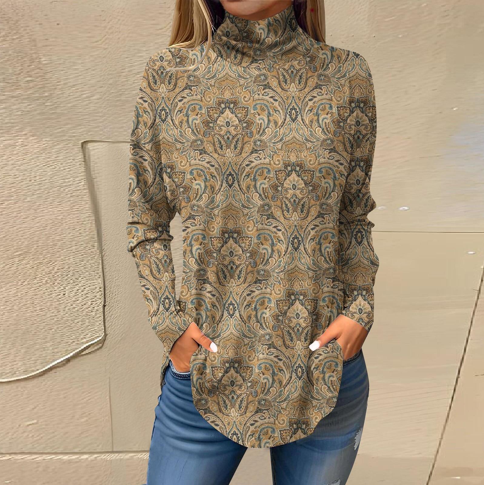 Футболки для женщин, осенние повседневные рубашки с длинными рукавами, толстовка с винтажным принтом, топ с высоким воротом, пуловер L хаки