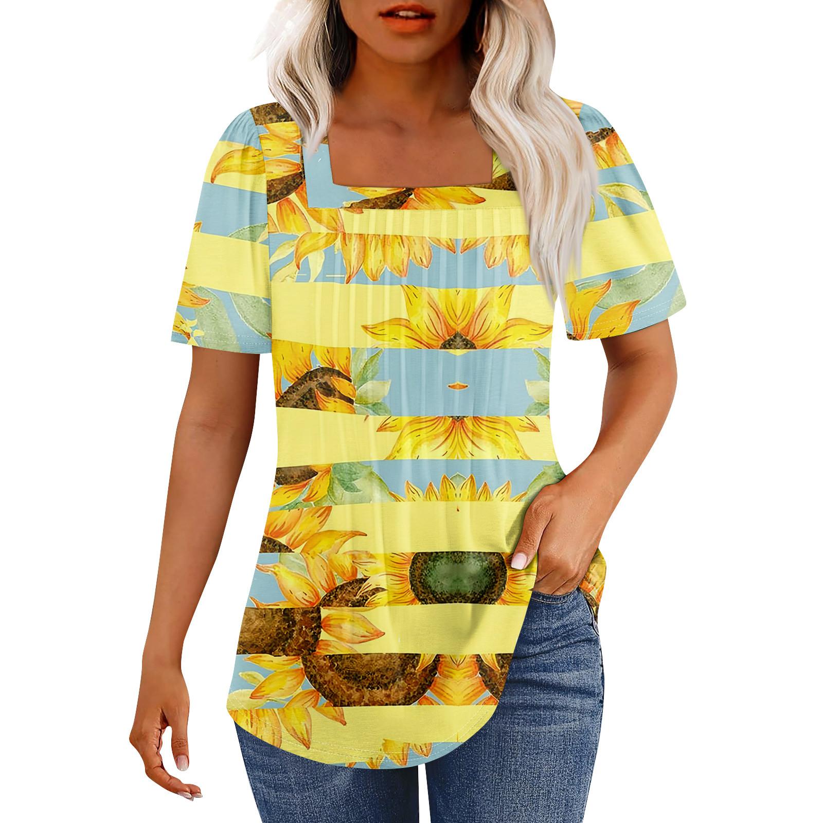 Футболки для женщин, плиссированные, с квадратным вырезом, нарядные, повседневные, блузки с принтом, с коротким рукавом, летние топы свободного кроя XL жёлтый