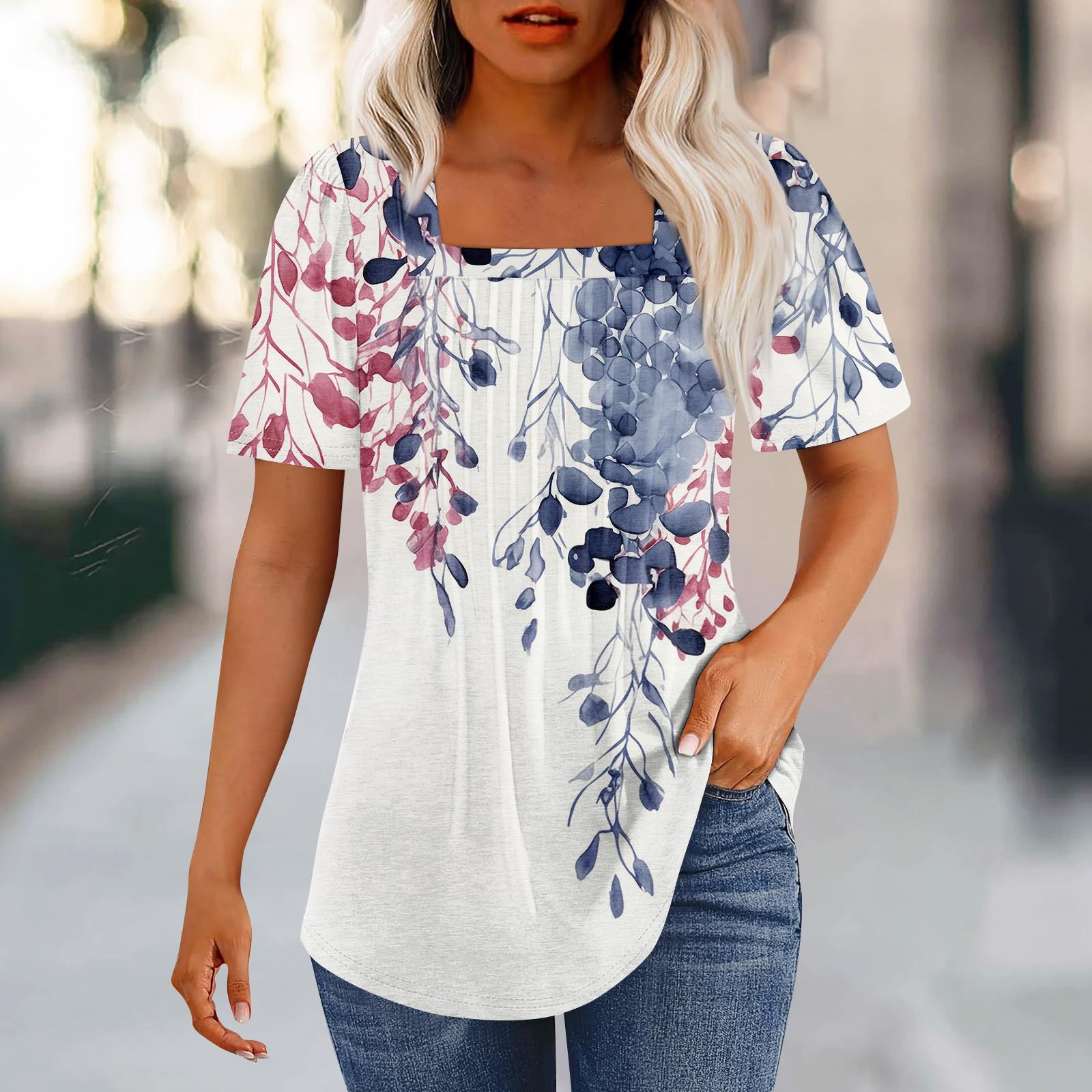 Футболки для женщин, плиссированные, с квадратным вырезом, нарядные, повседневные, блузки с принтом, с коротким рукавом, летние топы свободного кроя XL белый