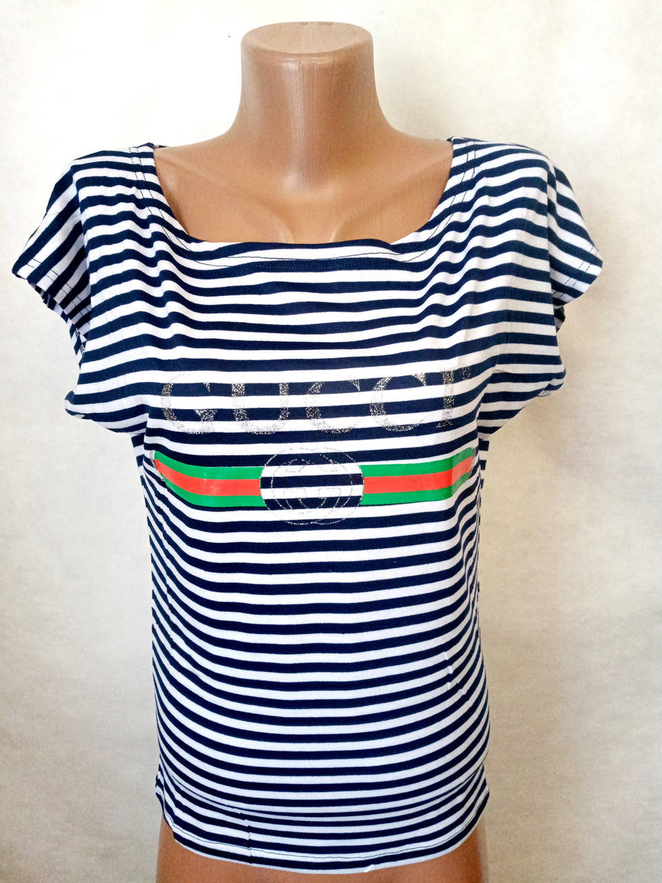 Футболки женские летние синие в полоску, коттон+стрейч+вискоза. Силуэт приталенный. Ткань хорошо тянется.