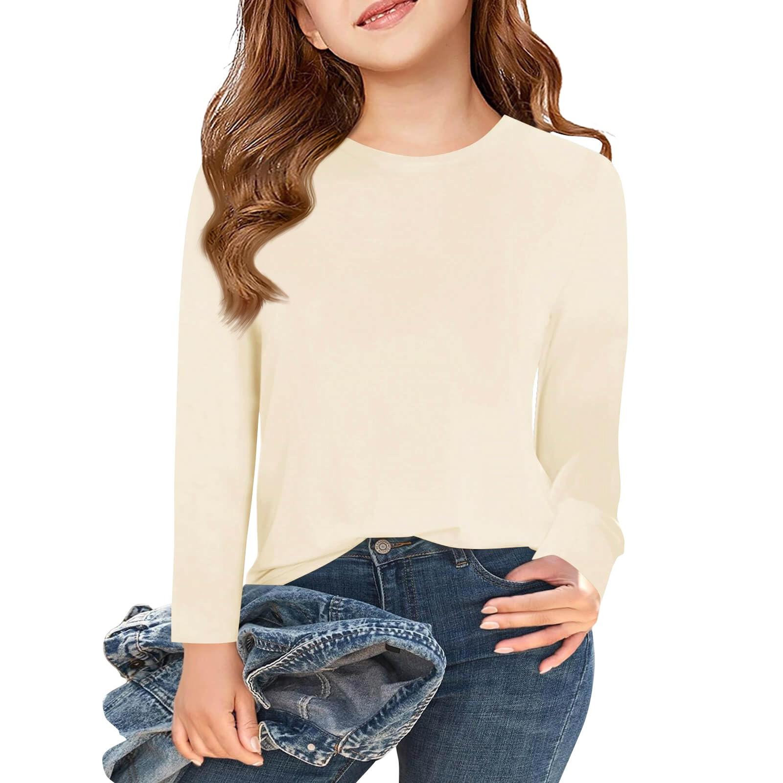 Футболки с длинным рукавом для девочек, детские осенние топы с круглым вырезом, базовые футболки для детей 5–14 лет 110 бежевый