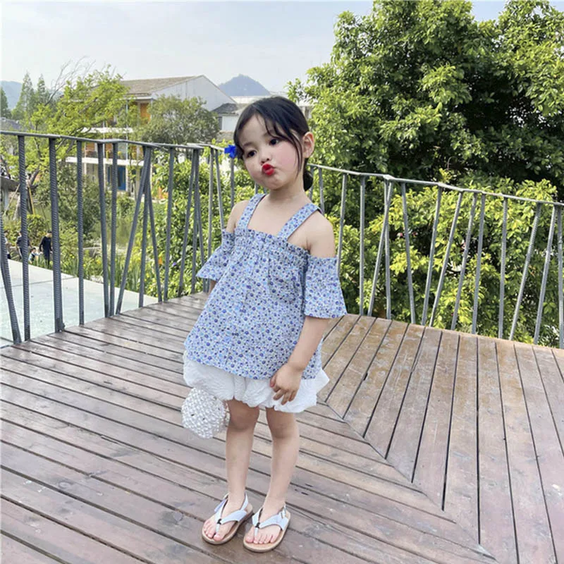 Футболки с цветочным рисунком для девочек; Новинка; Модные детские блузки на бретельках без бретелек; Летние однобортные Топы; Одежда