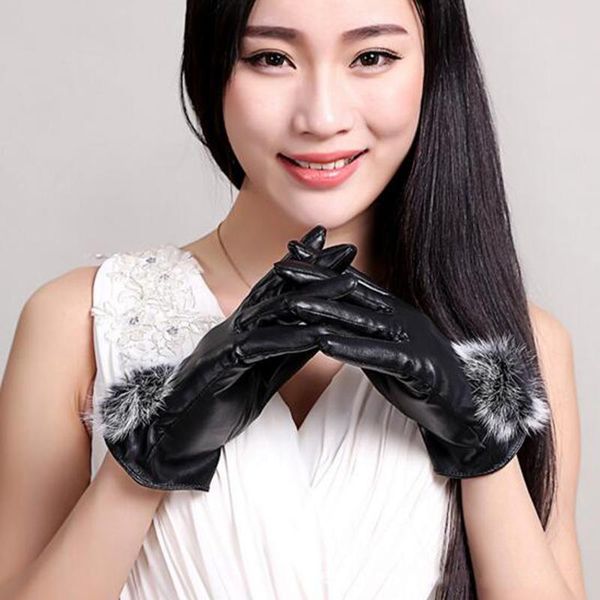 five fingers gloves elegant charm fur ball pu leather winter warm mittens wrist soft covered finger women fashion accessory, Blue;gray