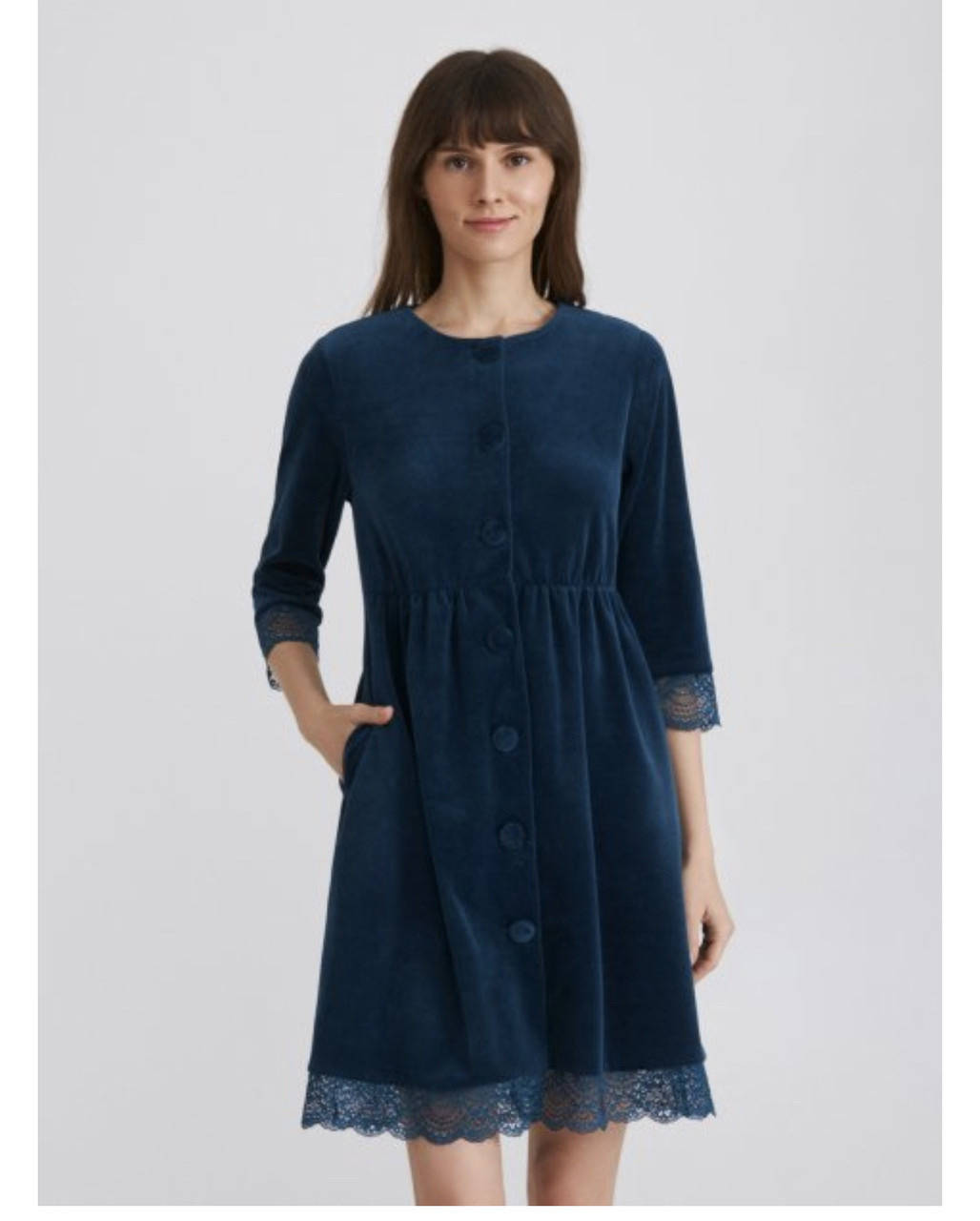 Халат c пуговицами. Есть карманы.