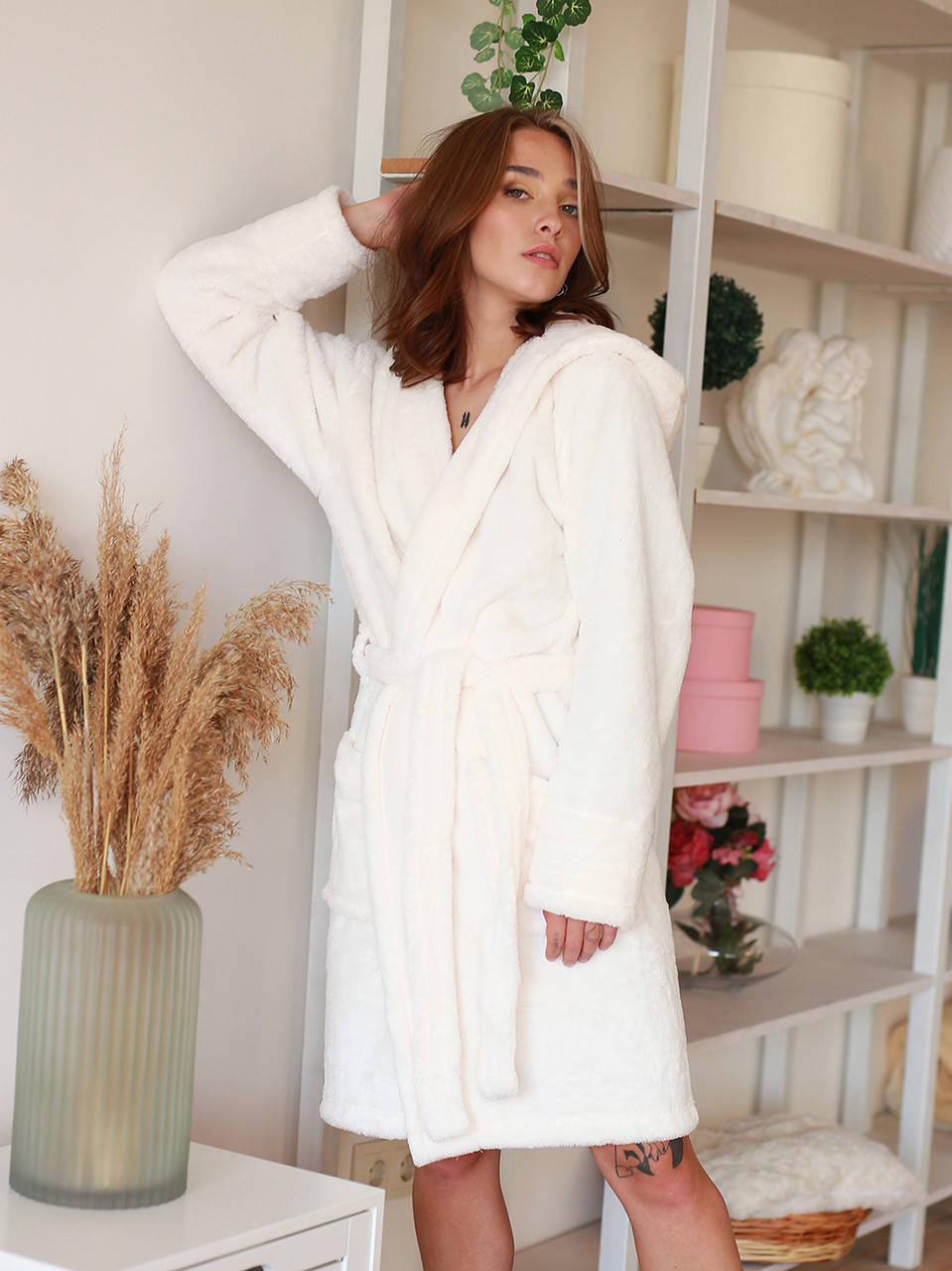 Халат на запах, с капюшоном и карманами, есть пояс;