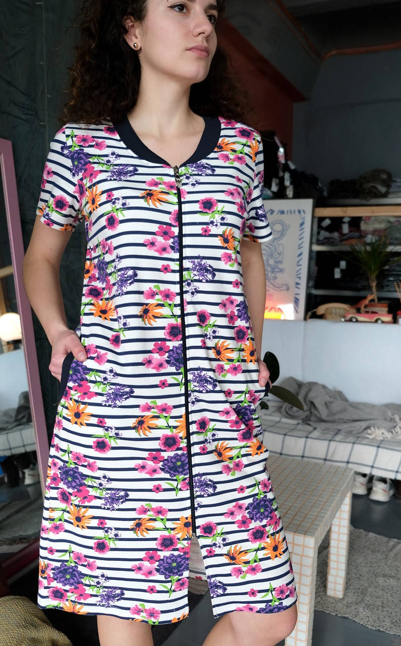 Удобный и мягкий халат из трикотажного полотна "кулир". Веселый летний принт халата на полоске. Короткий рукав не стягивает руку, свободный крой и боковые карманы очень функциональны и обеспечивают комфорт в носке.