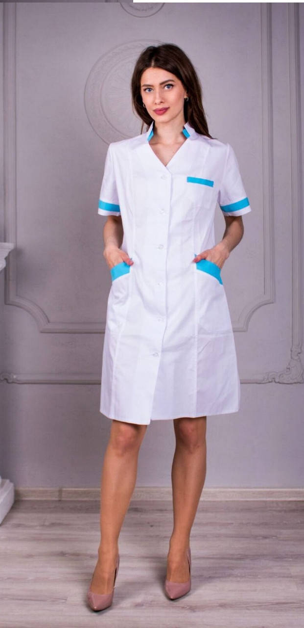Халат медицинский женский, короткий рукав, голубой, Белый