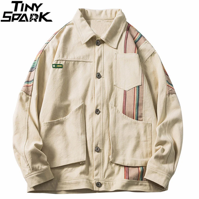Хип-хоп цветная Лоскутная джинсовая куртка 2021 Мужская Уличная полосатая куртка Осень Harajuku хлопковая Повседневная куртка с карманами
