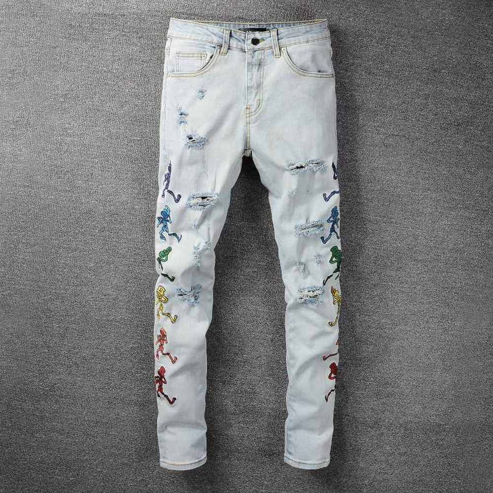 Amri amirly Hop Men's Jeans Brand Designer Fashion Personalized Pants Cool Hip Stylish Leisure Embroidery Ripped Style Slim Fit Denim Elastic, Blue