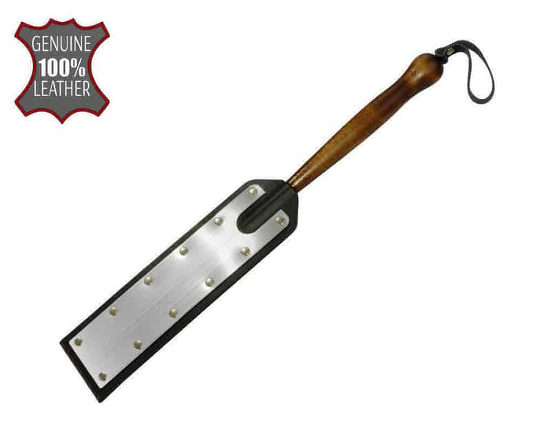 Шлепалка изготовлена из натуральной кожи и декорирована вставкой имитирующей металл. С одной стороны ударная часть хлопушки имеет кожаную поверхность, с другой декоративную вставку. По вашему желанию, на хлопушке можно разместить логотип или надпись.
