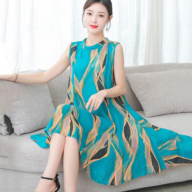 Хлопковое шелковое платье женское летнее для мам без рукавов средней длины свободная большая домашняя ночная юбка пляжная юбка XL синий