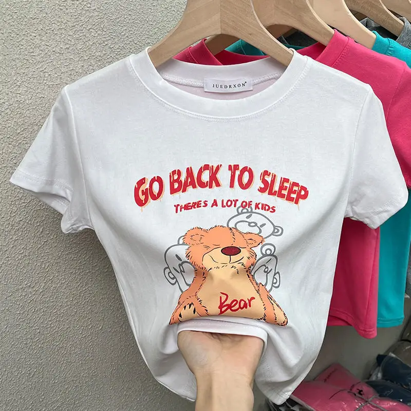 Хлопковый эластичный Топ бренди Ins высокого качества, пикантные укороченные топы для девочек в стиле преппи, милые Мультяшные футболки с рисунком медведя, большой размер 2XL, лето 2022