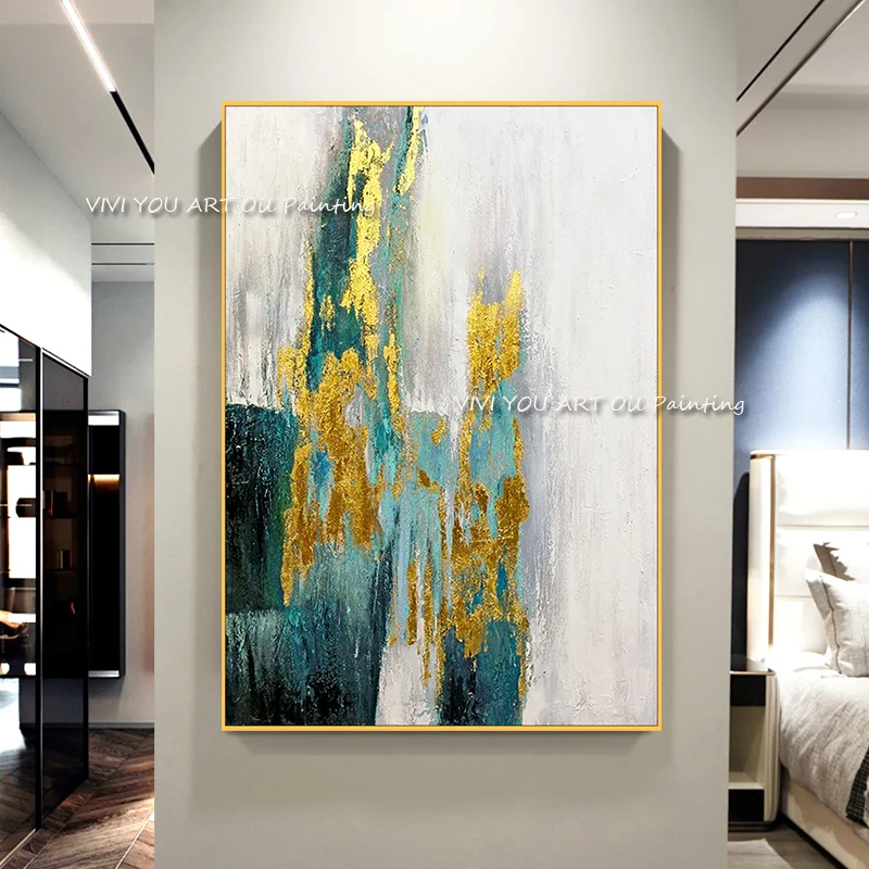 Холст большого размера, абстрактная Золотая фольга, картина маслом, красочная зеленая Ручная роспись для спальни, гостиной, домашний декор, ...