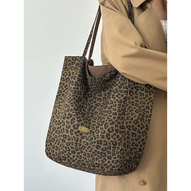 Холщовая сумка в стиле ретро с двухсторонним леопардовым принтом на заднюю часть, новая сумка-тоут большой вместимости для поездок на работу и обратно, универсальная сумка через плечо