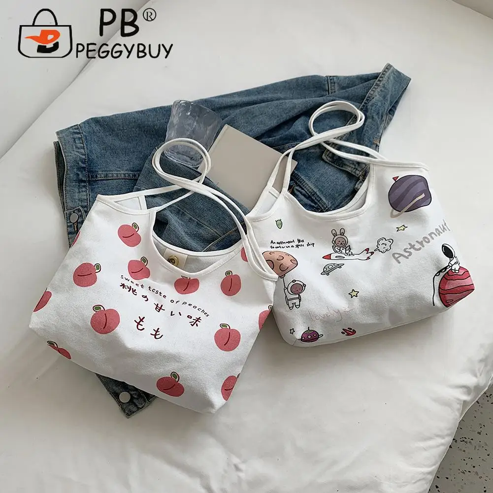 Холщовые сумки-тоуты на ремне для женщин, складные вместительные дорожные дамские сумочки для покупок с мультяшным принтом