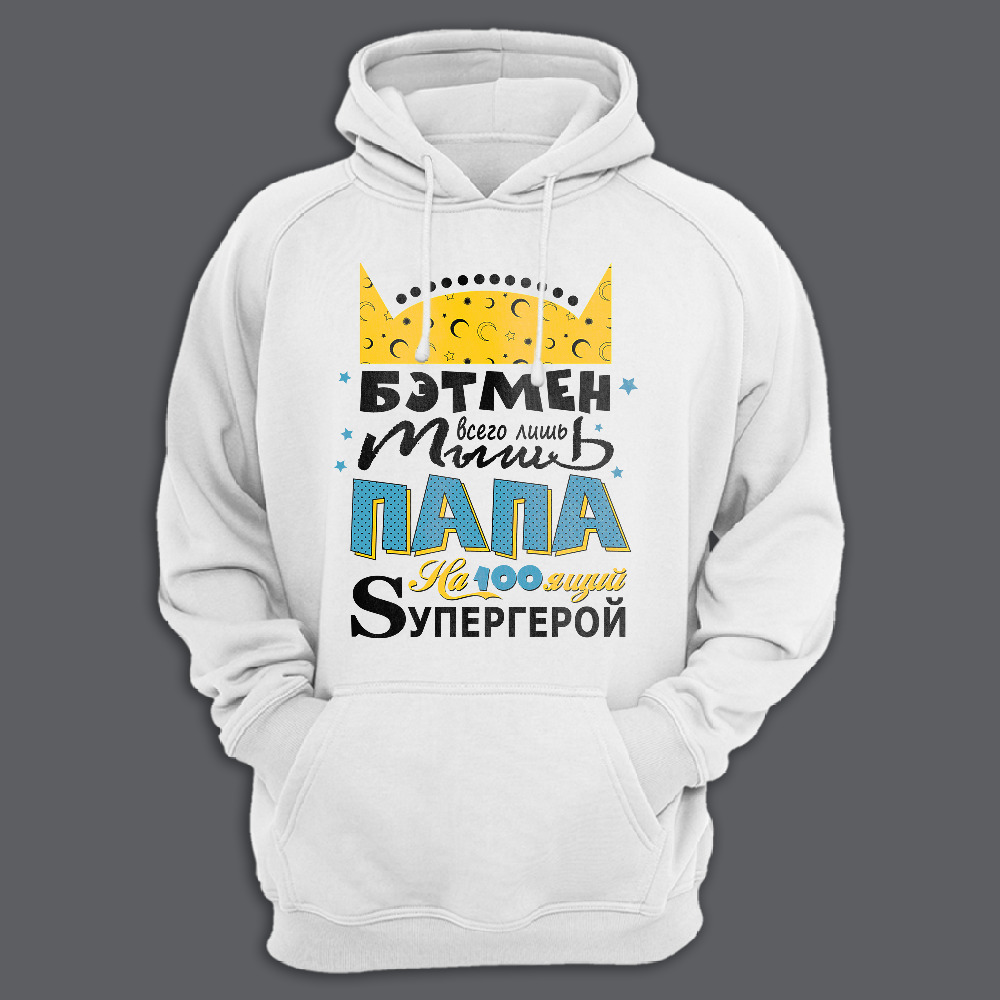 Прикольная мужская толстовка с капюшоном худи с надписью «Бэтмен всего лишь мышь, папа на100ящий Sупергерой». Модный смешной свитшот с капюшоном - это толстовка с капюшоном без молнии для мальчиков, для девочек, для подростков и для взрослых с прикольным принтом. Все мужские и женские худи без молнии состоят из 100% хлопка. Кофты с капюшоном идут размер в размер и должны смотреться свободно, поэтому не следует выбирать слишком маленький размер, а лучше выбрать размер с запасом. Цвет: белый c желто-черно-голубым принтом.