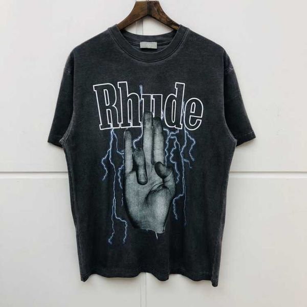 summer rhude fashion brand same flash palm wash old short sleeve t-shirt men's loose cotton tee, White;black