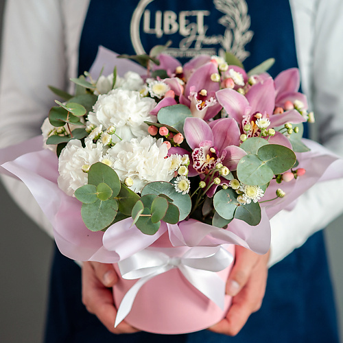 ЦВЕТНИК ЦВЕТЫ И ПОДАРКИ Розовая орхидея с белыми диантусами в шляпной коробке, Розовая орхидея с белыми диантусами в шляпной коробке