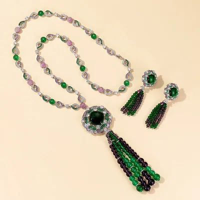 Серебряный Банкетный кулон S925 с зелеными кисточками, ожерелье, серьги, комплект ювелирных изделий, Изящные Ювелирные изделия на заказ