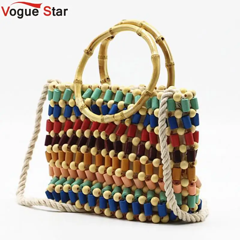 Цветная тканая сумка с цветными бусинами, ручная сумка через плечо с жемчугом, соломенная сумка через плечо, Женская Высококачественная модная деревянная маленькая сумочка L151