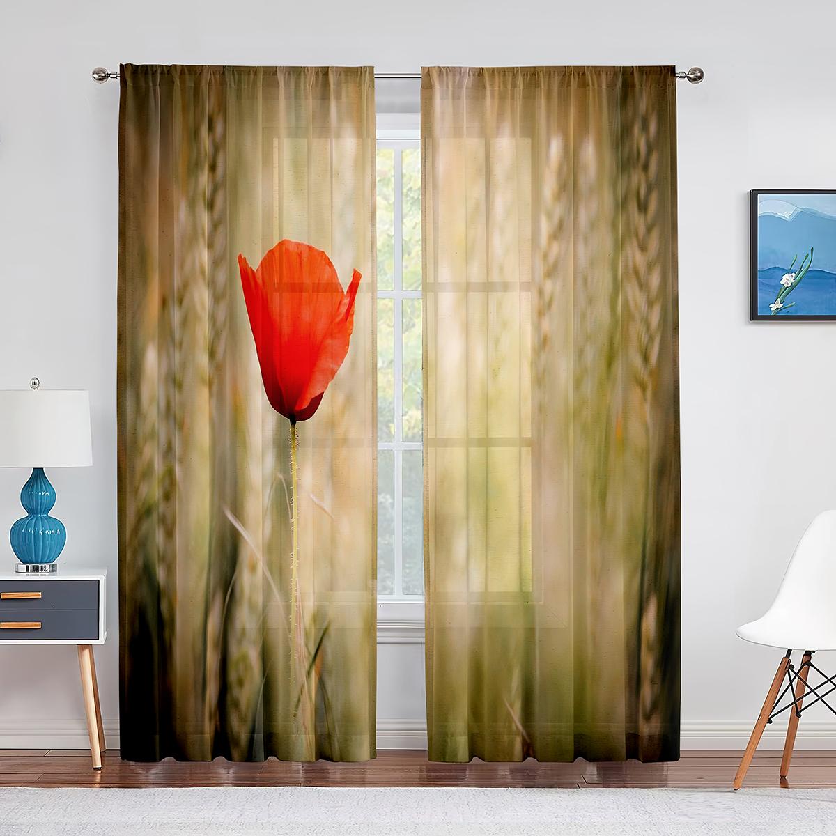 Цветок мака, прозрачная вуаль с красным цветочным принтом, шторы для гостиной, спальни, кухни, тюлевая оконная занавеска, украшение для дома, шифоновые шторы 1 PCS W100XH250cm&Grommet Top