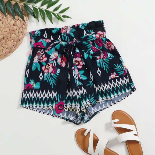 Многоцветный Бохо Искусственный шелк Со цветочками этнический стиль Широкий Неэластичный Лето Шорты, size features are:Bust: ,Length: ,Sleeve Length: