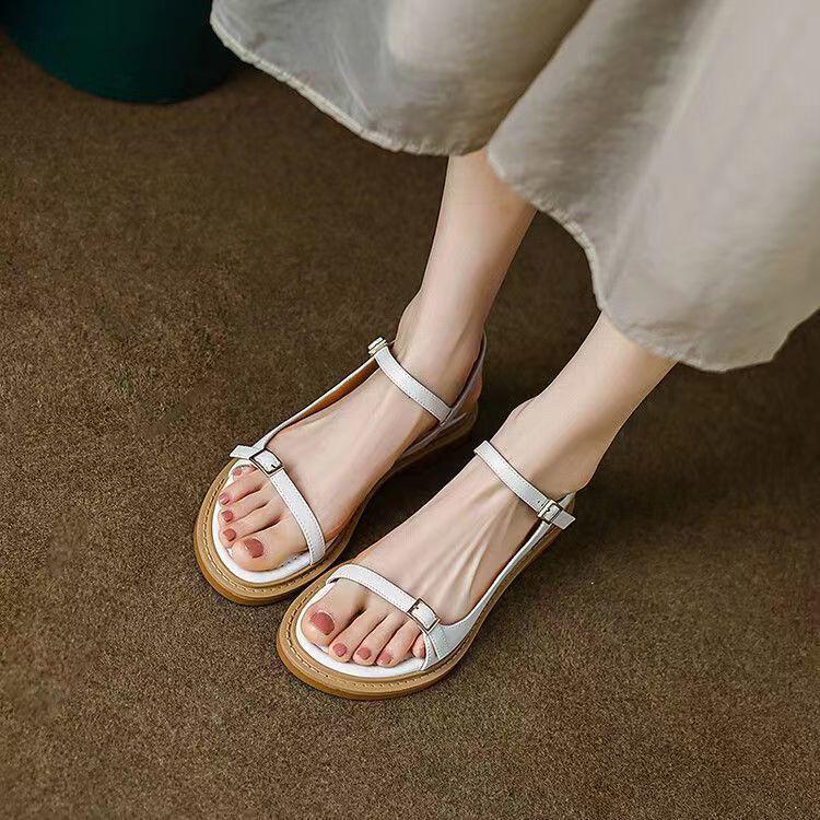 Цельные женские сандалии в стиле ретро, летнее платье для детей 2024 года, летние новые римские туфли на плоской подошве, низкий каблук, толстый каблук 40 белый