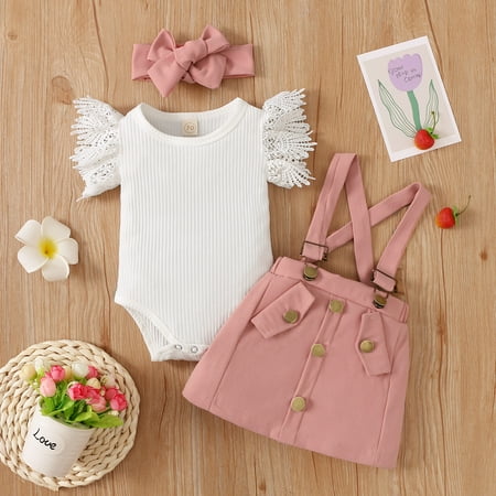 Hunpta Infant Girls Ruffles Fly Sleeve Solid Ribbed Romper Lace Bodysuits Suspenders Skirt Headbands Outfits