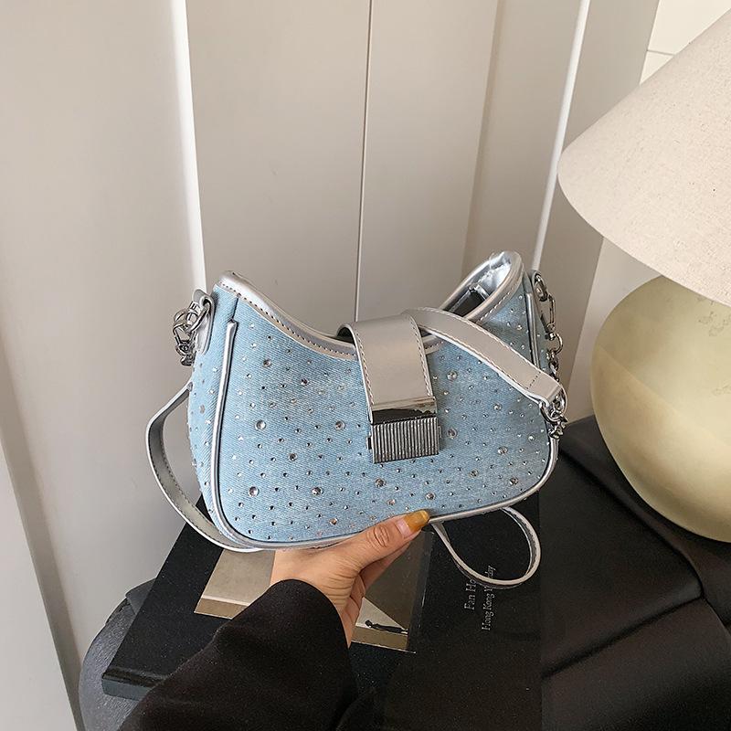 Цепочка ниша яркая бриллиантовая сумка женская новая модная универсальная сумка-мессенджер джинсовая на плечо под мышку серебряный
