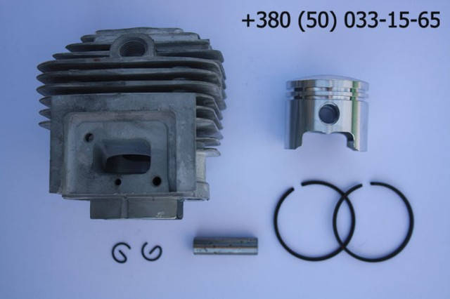 Цилиндр с поршнем для мотокосы в сборе диаметр 44 мм. В комплекте: цилиндр, поршень, поршневые кольца, палец, стопорные кольца. Объем группы 52 см.куб.