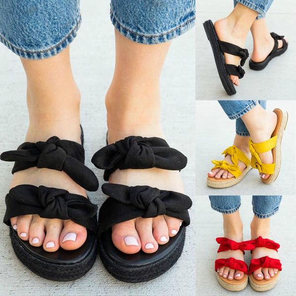 slippers summer women 2021 thick platform flat heel bowtie sole peep toe casual fashion beach ladies shoes zapatos de mujer, Black