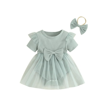 Baby Girl 2 Piece Summer Set Short Sleeve Round Neck Ribbed Romper Dress + 3D Bow Headband Infant Toddler Outfits
