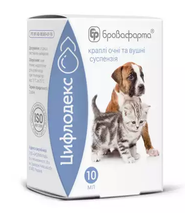 Лечение собак, котов, мелких экзотических и декоративных животных (декоративных кроликов, хомяков, крыс, мышей, морских свинок, попугаев, рептилий) при острых и хронических воспалениях глаз и ушей, которые являются следствием бактериального, химического или травматического воздействия — конъюнктивит, блефарит, кератит, кератоконъюнктивит, иридит, иридоциклит, язвы и эрозии роговицы, заболевания глаз после травм, попадания инородных тел или агрессивных соединений, в пред- и послеоперационные периоды, а также лечение отита, отореи, в частности вызванных сторонним вмешательством.
