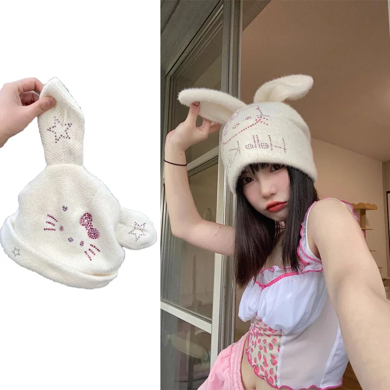 Мультяшные милые аниме Hellokittys розовые Горячие бриллианты кроличьи ушки Плюшевые Вязаные зимние теплые милые шерстяные шляпы для девочек для улицы