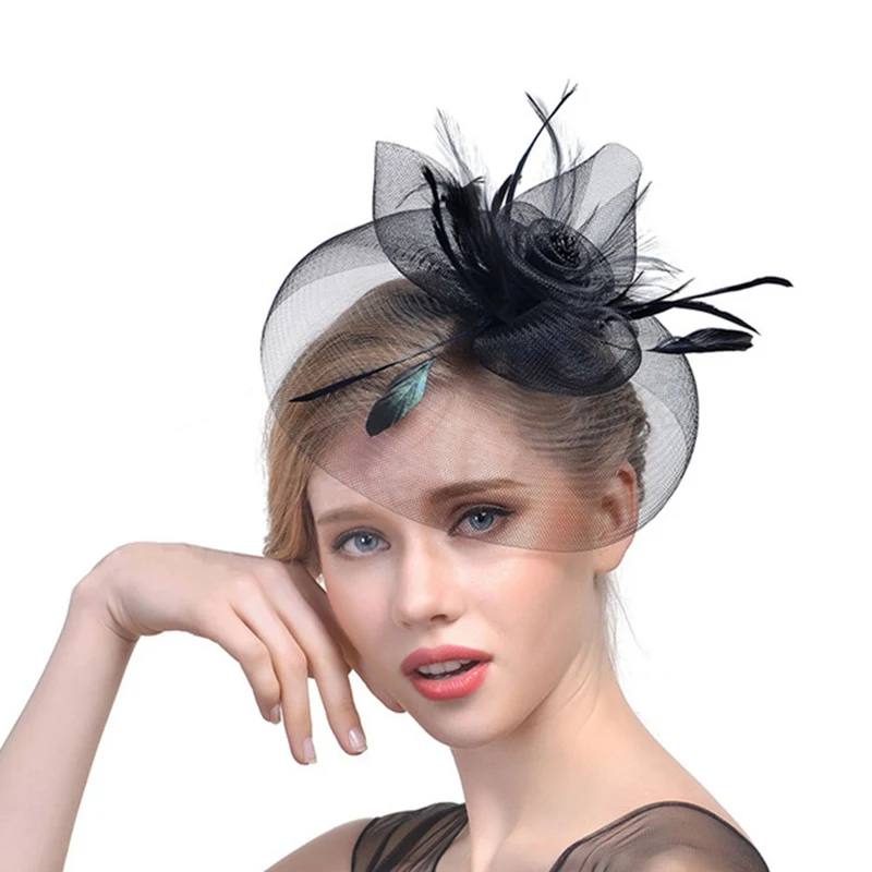 Feather Fascinator Hat Clips Women Fancy Black Birdcage Veil Wedding Hats Hair Accessories Headband Hat Lady Bride Party
