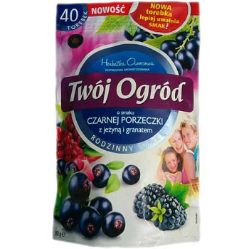 Twoj Ogrod Porzeczki — это фруктовый натуральный чай с кусочками черной смородины, ежевики и граната. В составы фруктового чая не входят обычные чайные листья. Употреблять фруктовый чай можно как горячим, так и холодным. В летнее время это вообще замечательный прохладительный напиток. В зимнее - приятный и согревающий. На упаковке имеется пластиковая защелка. После вскрытия пакета, закрываем его и чай сохраняет свой аромат.