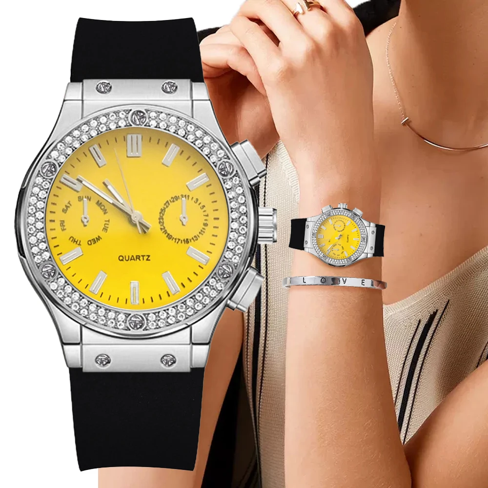 Часы женские кварцевые с силиконовым ремешком, роскошные брендовые модные с желтыми кристаллами-гвоздиками, черные