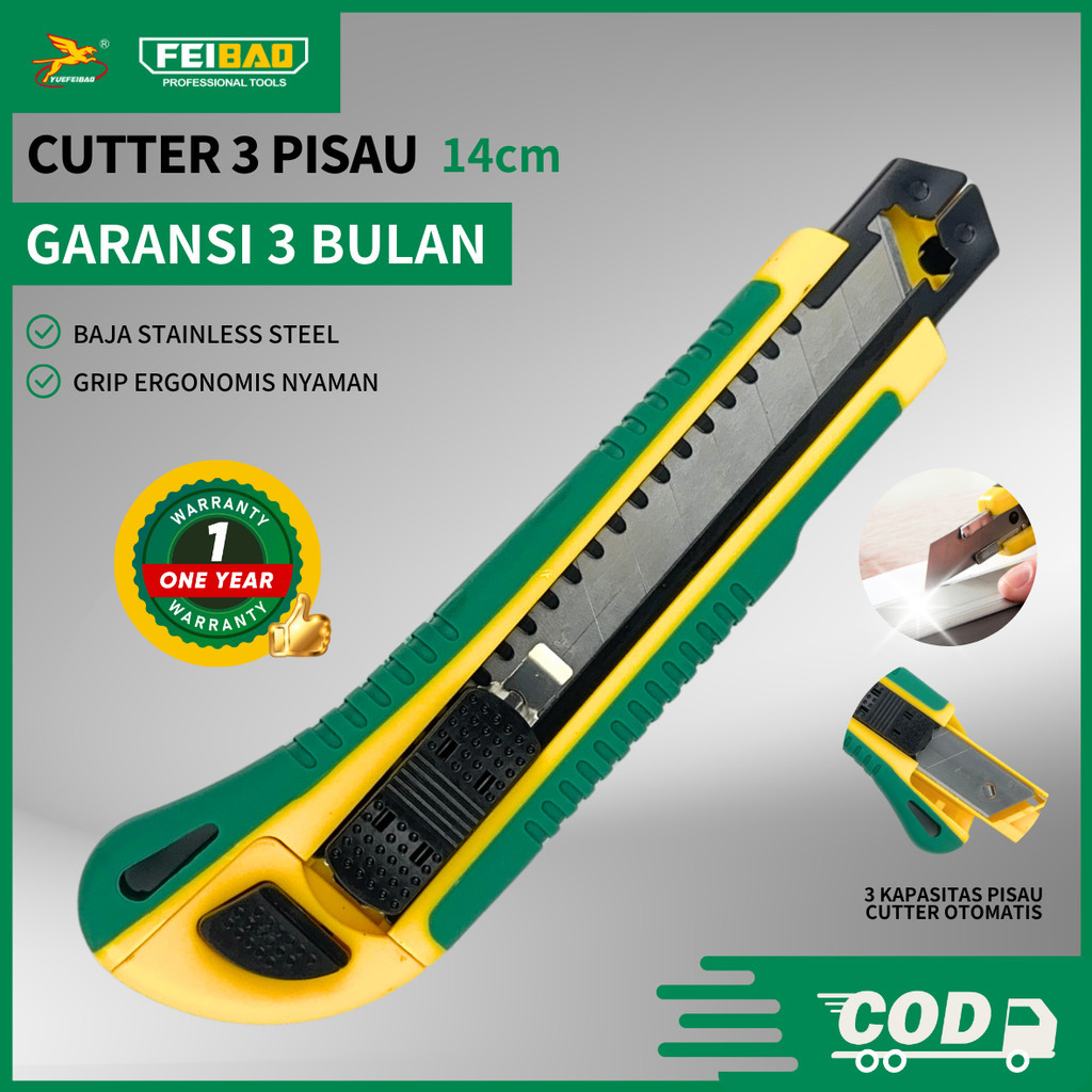 Feibao Cutter 3 Pisau / 3 Blade Utility Knife / Penggantian Otomatis / Stainless Steel / F32-3