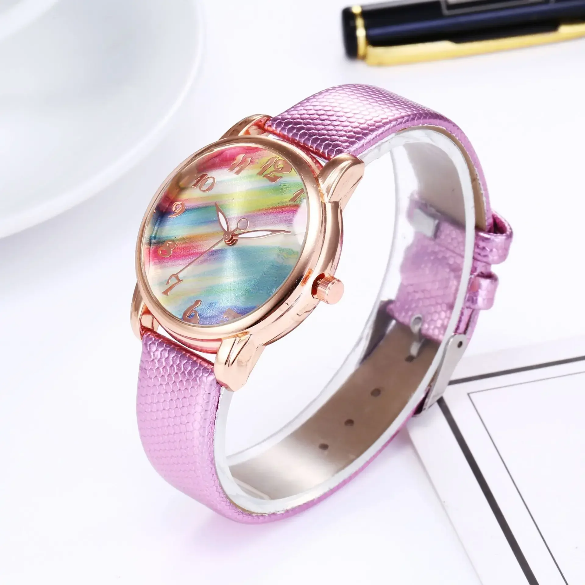 Часы наручные женские кварцевые, модные радужные, с кожаным ремешком, повседневные