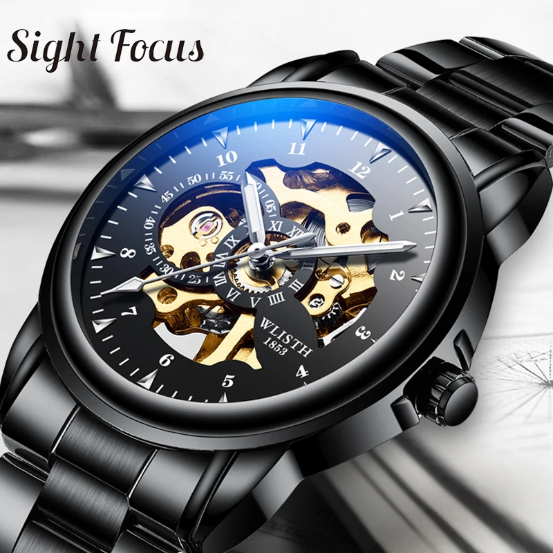 Часы наручные мужские механические, автоматические светящиеся с браслетом из нержавеющей стали, черные