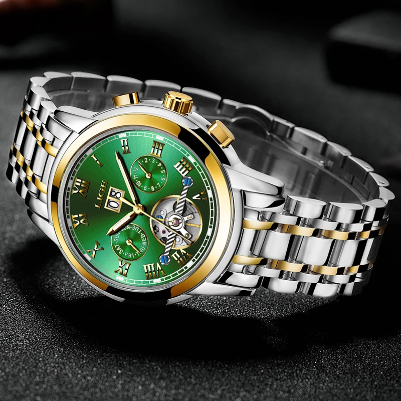 Часы наручные LIGE Мужские механические, водонепроницаемые, полностью стальные, с большим циферблатом, с датой и месяцем недели, с коробкой, ...