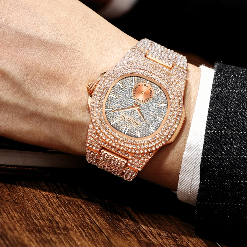 Часы наручные PINTIME Мужские кварцевые, роскошные полностью алмазные, в стиле хип-хоп