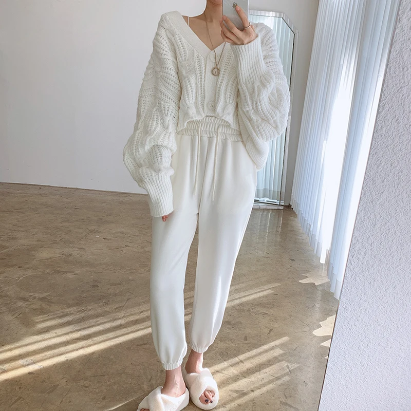 2021 South Korea Autumn V-neck Single-breasted Loose Wild Linen Pattern Knitted Cardigan Sweater Jacket DK1180